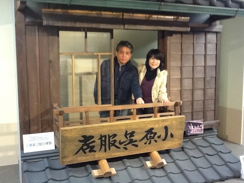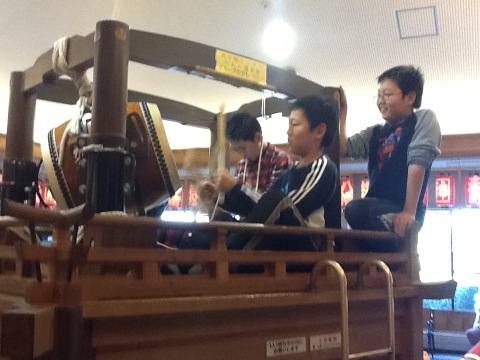 NHKのカーネーション展に来て喜ぶ奥さんとのツーショットです。さすがだんじりの町、博物館の太鼓を地元の小学生が競って叩き続けてました。